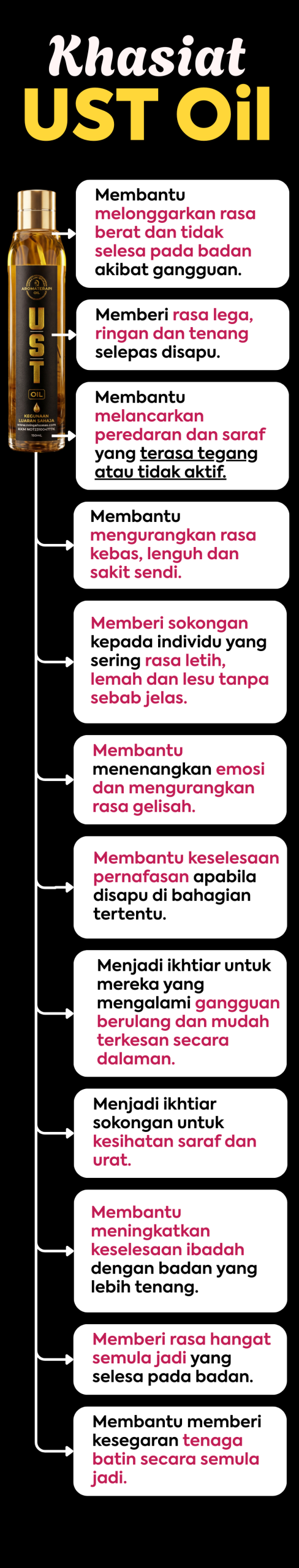 UST Oil sangat sesuai untuk anda yang dah lama menanggung sakit, gangguan emosi, sihir pemisah, badan lemah, cepat penat, susah tidur dan rumah tangga jadi tak aman.