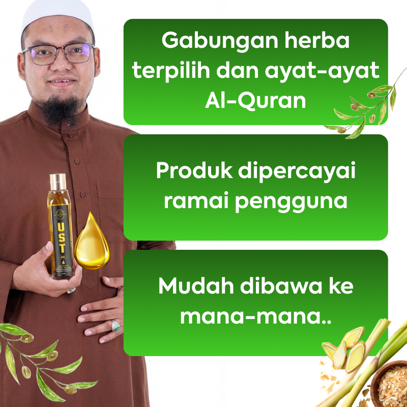 UST Oil ialah minyak herba ikhtiar luaran yang dirumus khas berasaskan rawatan Islam & saraf, digunakan untuk bantu masalah gangguan, sihir, saraf dan keletihan badan dengan izin Allah.